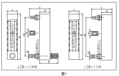 LZB-()W系列流量計不帶流量調(diào)節(jié)閥,外形及安裝尺寸見圖1和表1。 |