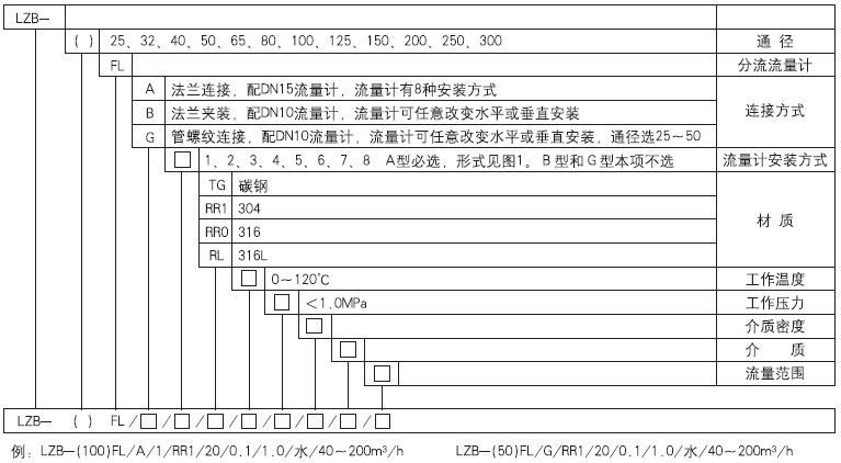 LZB-()FL系列流量計(jì)有主管道、主孔板、分流管道、限流孔板、轉(zhuǎn)子流量計(jì)和斷流閥(可選)組成。