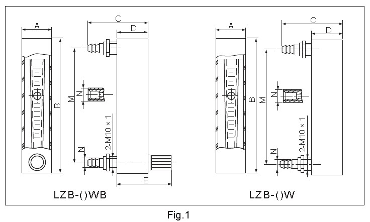 LZB-()WB series flowmeter equip with control valves,LZB-()W series flowmeter without control valve,see the outline and installation drawing as following:Fig.1 and Table 1