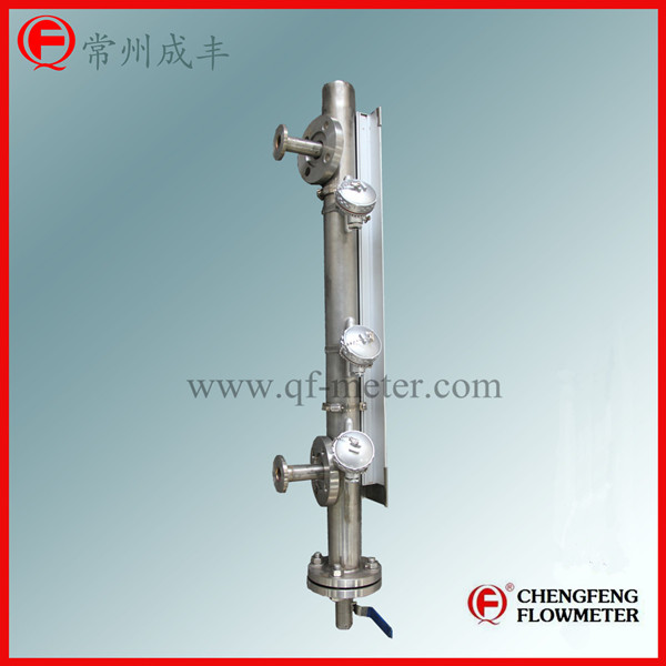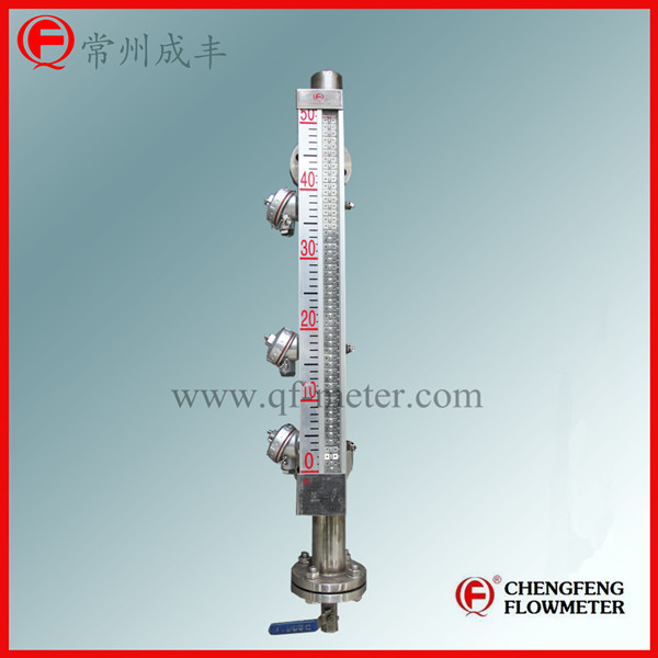 Level meter structure bases on the principle of bypass,the liquid lever in the main pipe is as same as that in the vessel device.According to Archimedes Theorem,the buoyancy force of magnetic float in the liquid is equal to the floater weight ,floater floats on the surface of liquid,the floater in the main pipe of level meter will move up and down with the movement of level in the vessel measured.The permanent steel magnet in the floater will turn 180° through the red-white turn post in the magnetic coupling drive indicator.When liquid lever rises, the turn post turns white side to red one,when the lever lowers,turn post turns red side to white one.The red and white interface of indicator is the actual height of media level in the vessel.Thus the level indication is realized.