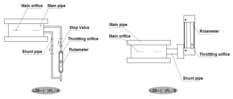 LZB-FL series rotary shunt flow meter is a kind of instrument composed by throttling device(orifice plate) of main pipeline and rotary flow meter(glass tube flowmeter,metal tube flowmeter) of separate pipeline,which can get the main pipeline flow through measuring the separate pipeline flowrate.